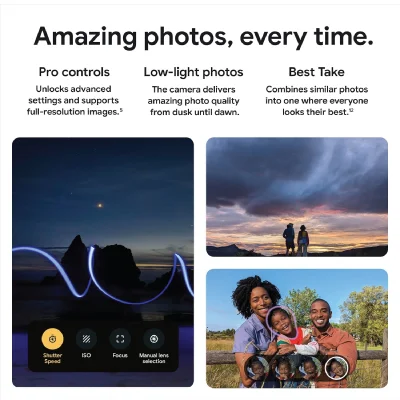 - Google Pixel 8 Pro has four updated pro-level cameras with Pixel’s best zoom ever[1]; Pro controls unlock advanced settings and support full-resolution photos[5]